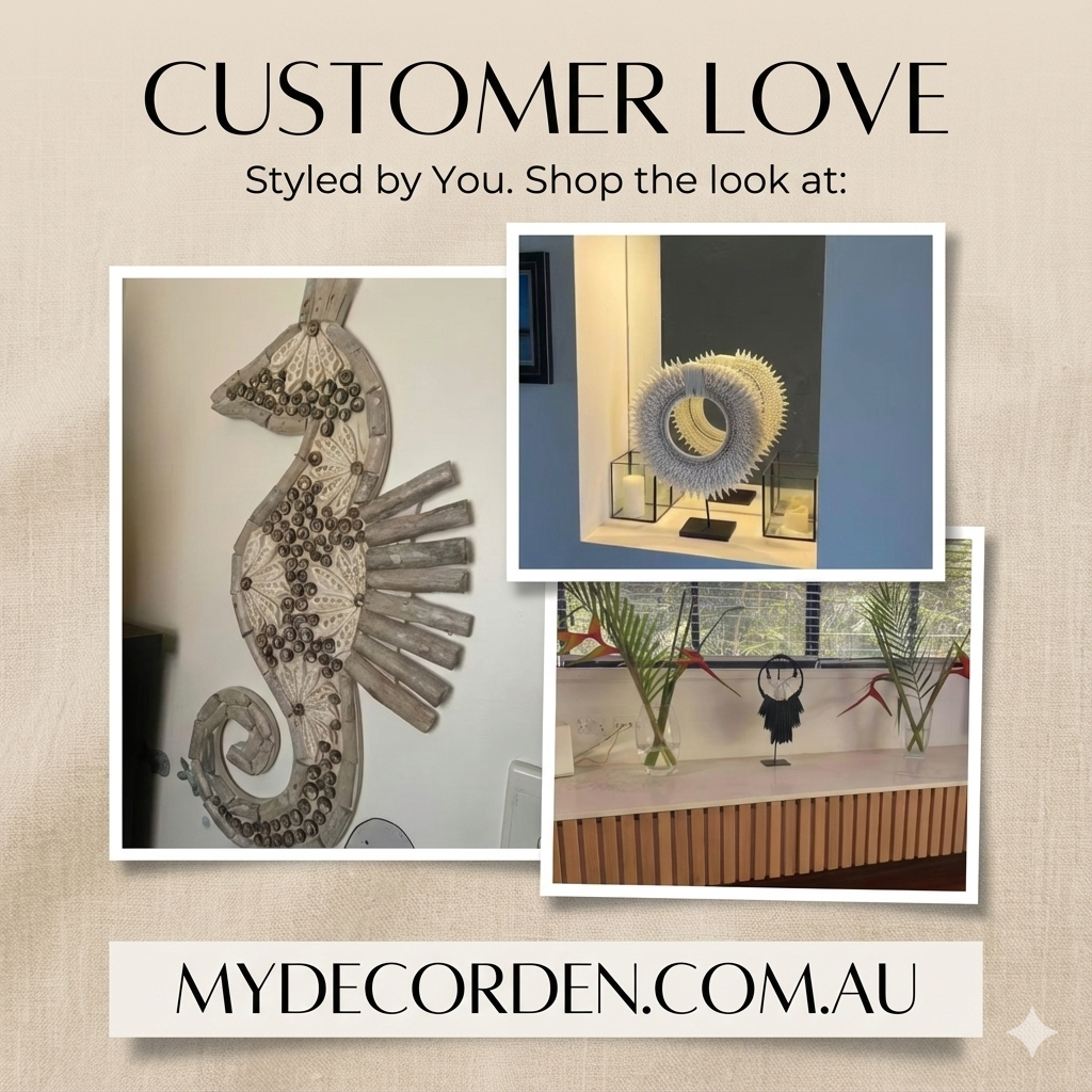 Nothing makes us happier than seeing how you style your My Decor Den finds! Our amazing customers are truly design inspirations, transforming their spaces with unique pieces that tell a story.Check out these gorgeous rooms featuring:The stunning Seahorse Driftwood Wall Art – a perfect touch of coastal charm!Our captivating Feather & Shell Necklaces on Stand, beautifully displayed in niches and on sideboards.You've got style, and we love to see it!
